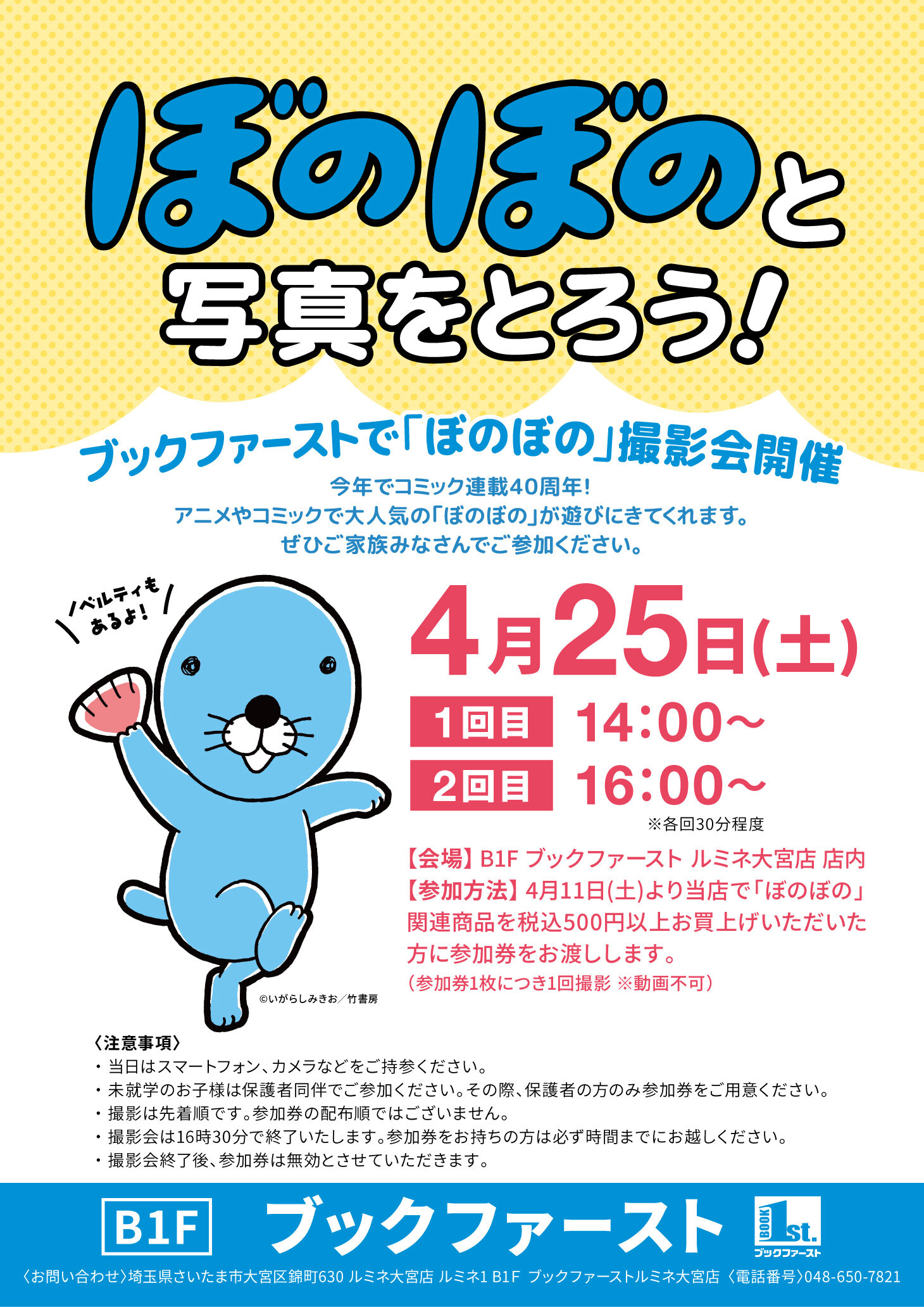 ブックファーストルミネ大宮店にて、コミック連載40周年記念!大人気の「ぼのぼの」がルミネ大宮店に遊びにきてくれます。
